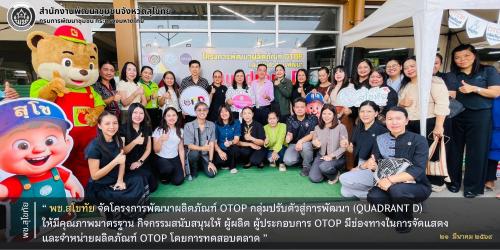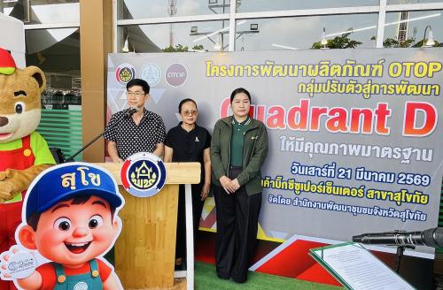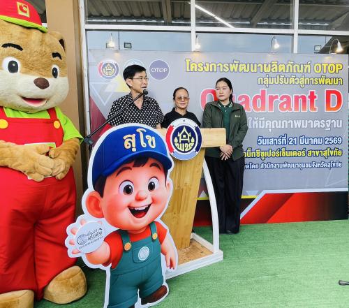 พช.สุโขทัย จัดโครงการพัฒนาผลิตภัณฑ์ OTOP กลุ่มปรับตัวสู่การพัฒนา (Quadrant D) ให้มีคุณภาพมาตรฐาน กิจกรรมสนับสนุนให้ ผู้ผลิต ผู้ประกอบการ OTOP มีช่องทางในการจัดแสดงและจำหน่ายผลิตภัณฑ์ OTOP โดยการทดสอบตลาด