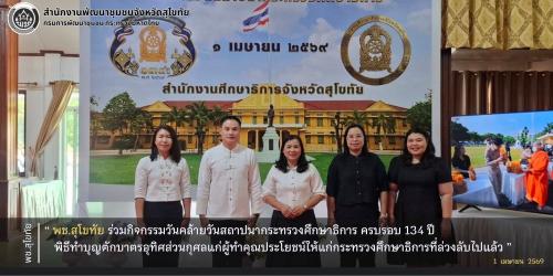 พช.สุโขทัย ร่วมกิจกรรมวันคล้ายวันสถาปนากระทรวงศึกษาธิการ ครบรอบ 134 ปี พิธีทำบุญตักบาตรอุทิศส่วนกุศลแก่ผู้ทำคุณประโยชน์ให้แก่กระทรวงศึกษาธิการที่ล่วงลับไปแล้ว